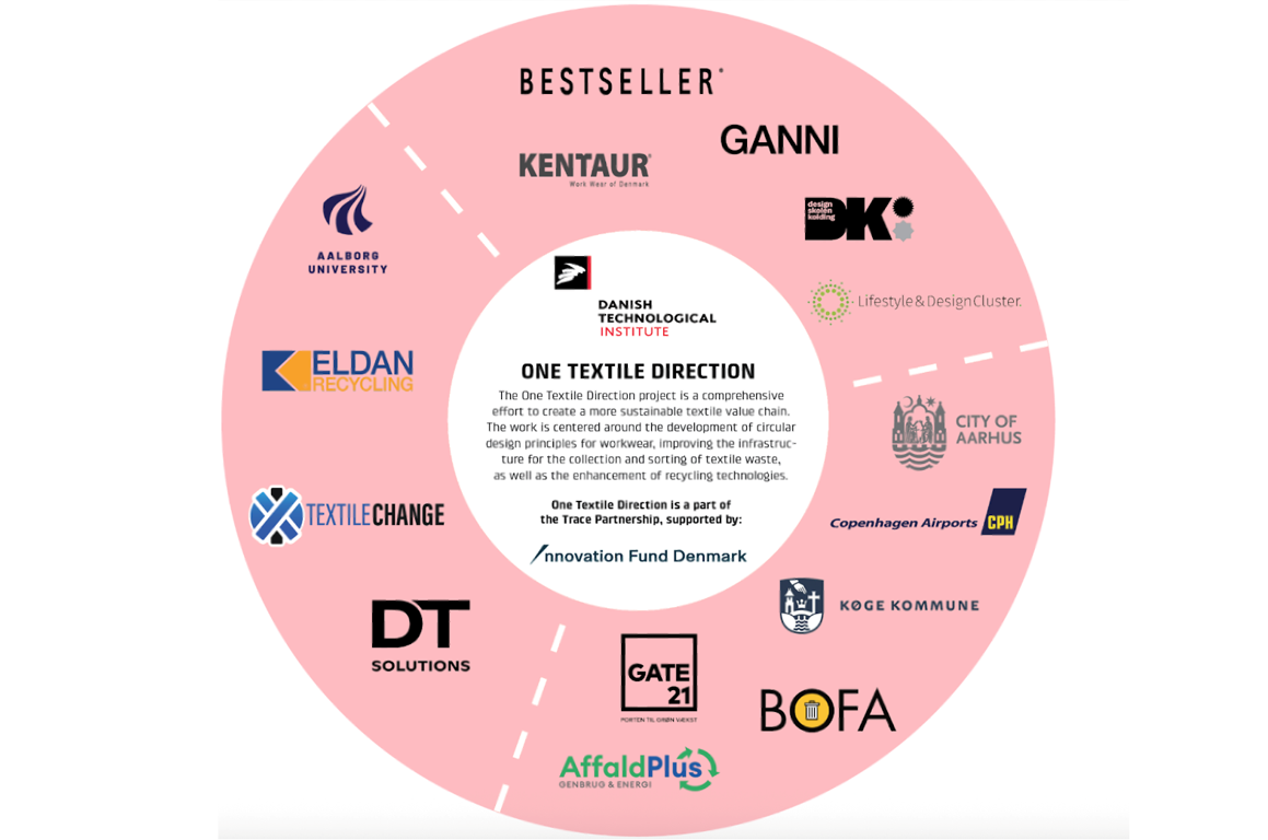 The One Textile Direction (OTD) project united 17 partners across the textile value chain—including municipalities, waste operators, technology providers, apparel companies, a design school, a university, a GTS institute, and an airport—to address barriers to textile circularity in Denmark.